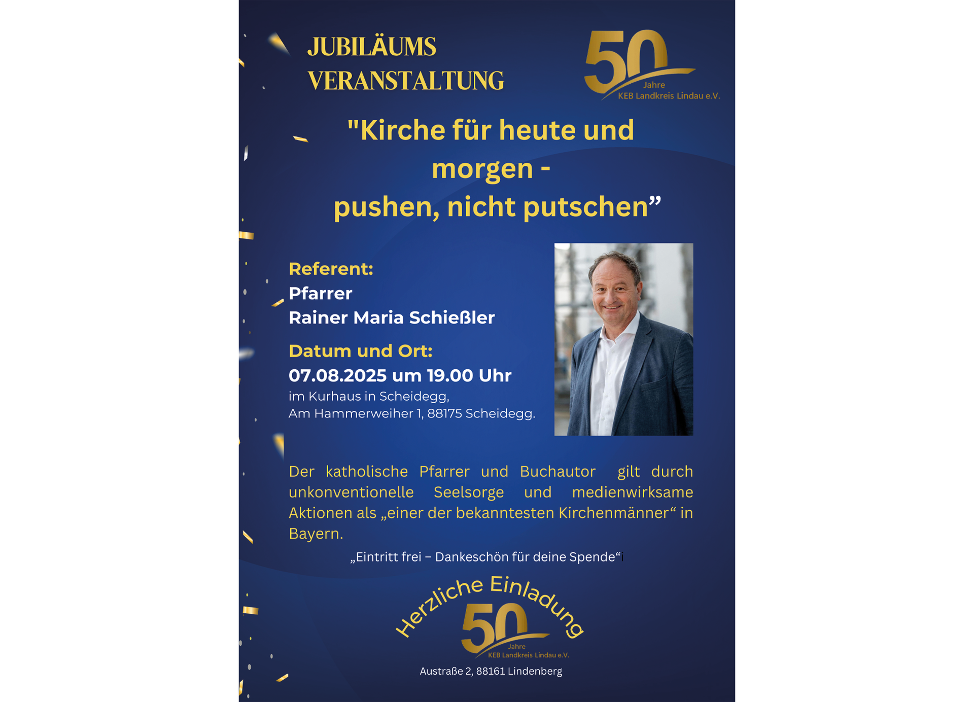 Unter dem Titel „Kirche für heute und morgen – pushen, nicht putschen“ sprach der bekannte Münchner Pfarrer Rainer Maria Schießler im vollbesetzten Kurhaus Scheidegg über die Zukunft der Kirche – und darüber, wie Veränderung nicht durch lautstarken Protest, sondern durch gelebtes Engagement und den Mut zu neuen Wegen entstehen kann.