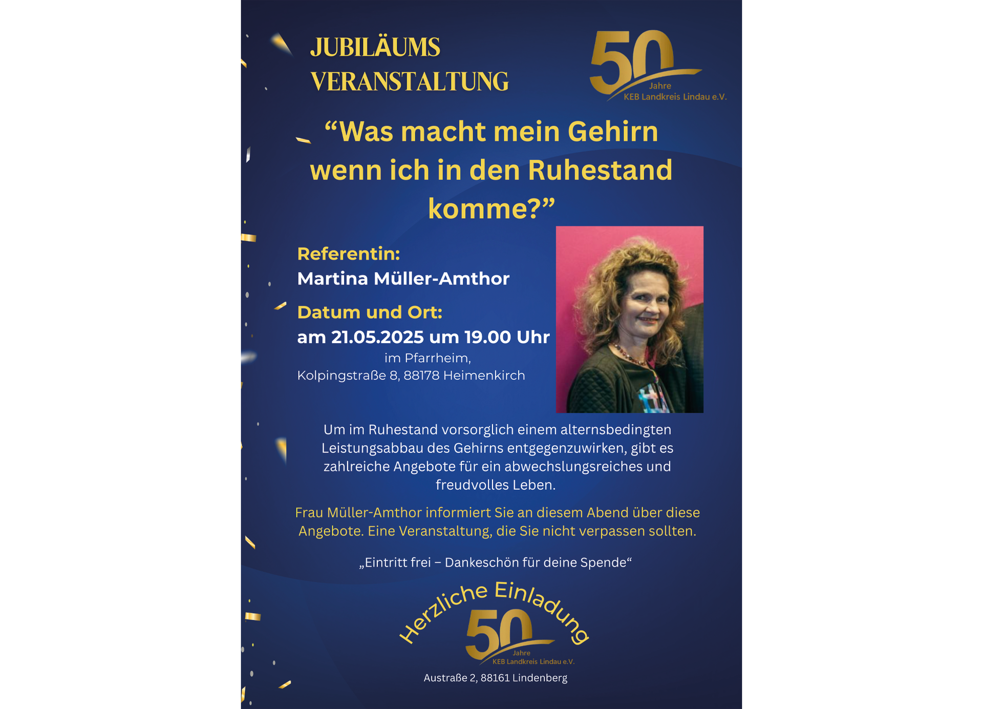 Den Auftakt der Veranstaltungsreihe anlässlich des 50-jährigen Bestehen der KEB Landkreis Lindau e.V. bildete ein inspirierender Vortrag von Martina Müller-Amthor, die mit wissenschaftlichem Know-how und praktischen Impulsen zeigte, wie der Übergang in den Ruhestand zur Chance für geistige Weiterentwicklung werden kann. Die Veranstaltung regte zum Nachdenken an und unterstützte zugleich das Projekt ..... durch die gesammelten Spenden.